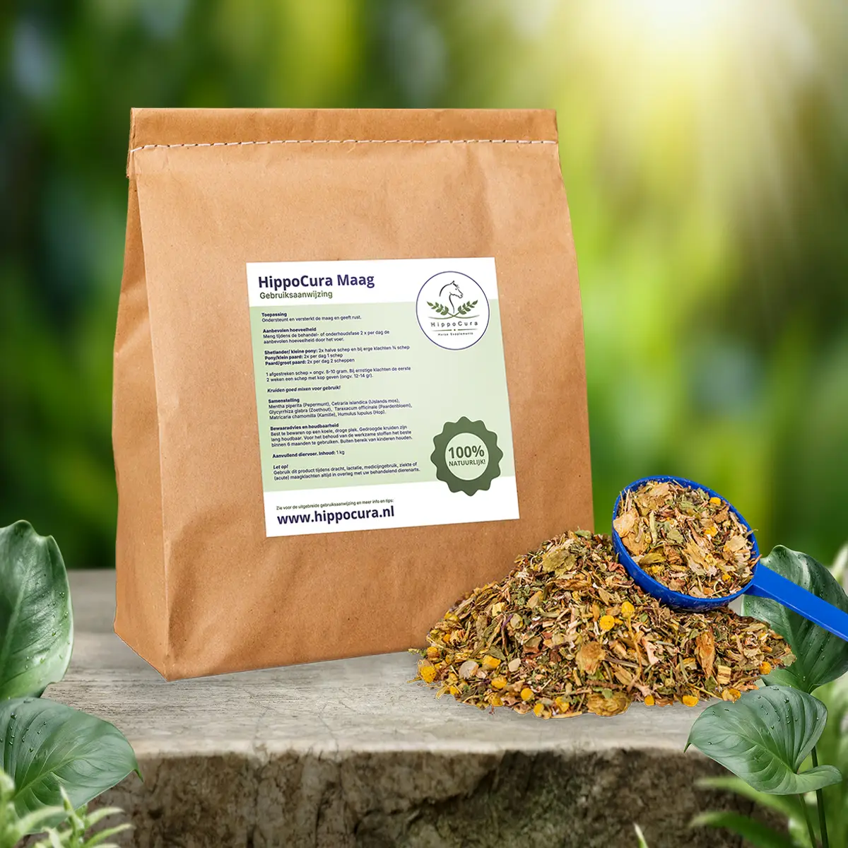 Deze 100% natuurlijke kruidenmix is speciaal ontwikkeld om de paardenmaag te versterken en ondersteunen. Het heeft ontstekingsremmende eigenschappen en werkt kalmerend en stress-verlagend. HippoCura Maag past uitstekend in een suiker- en zetmeelarm dieet en past goed bij de natuurlijke voerbehoefte van het paard. Door te kiezen voor HippoCura Maag, helpt je de maagklachten van je paard te verminderen en herhaling te voorkomen.